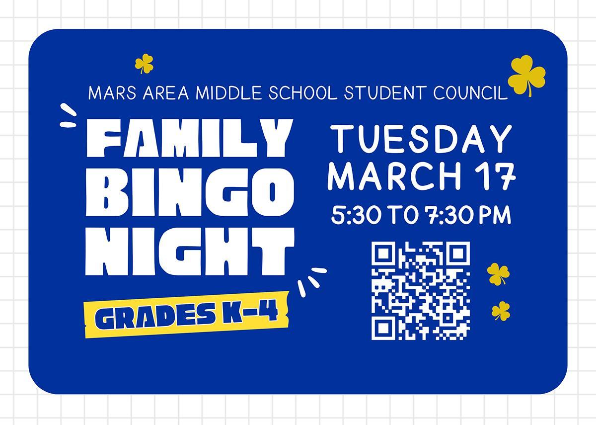 Mars Area Middle School Student Council will sponsor a Family Bingo Night for elementary students (Grades K-4) from 5:30 to 7:30 p.m. on Tuesday, March 17.